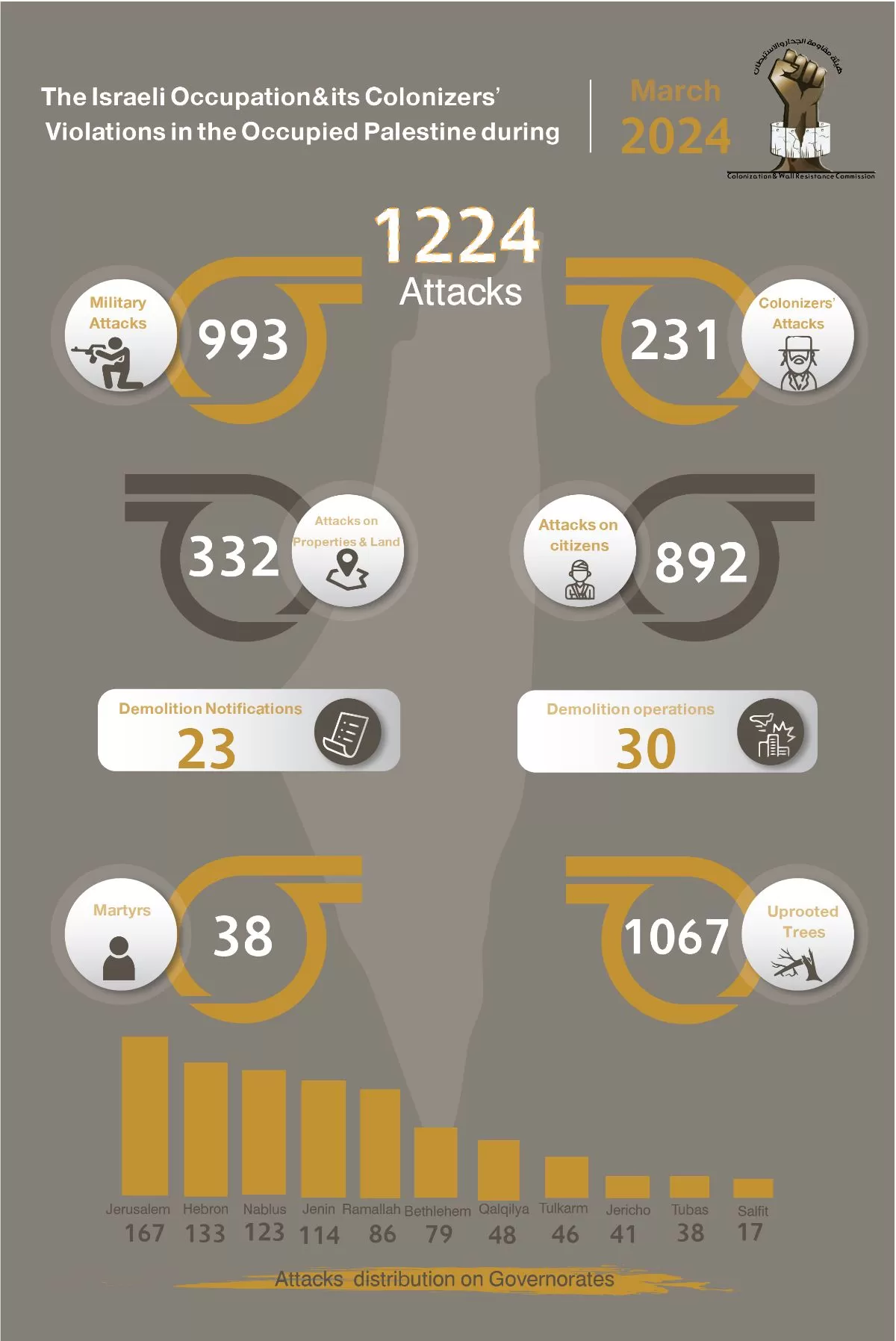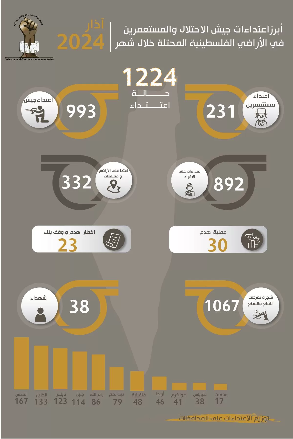 Ramallah, April 5, 2024: The head of the Colonization and Wall Resistance Commission, Minister Muayyad Sha’ban, stated that the Israeli occupation authorities and its colonizers committed 1224 attacks during March. 993 of these attacks were committed by the occupation army, while the colonizers committed 231 attacks. This is a continuation of a series of dangerous escalations in attacks that accompanied and took cover by the appalling aggression on our people in the Gaza Strip and the emergency laws that guarantee the occupiers to commit further crimes.
