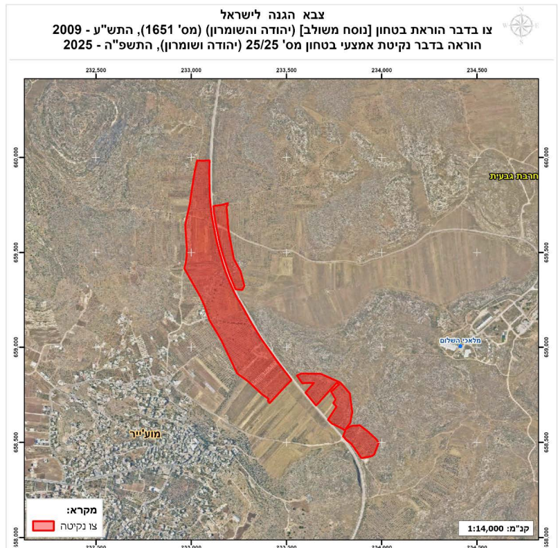 لأمر العسكري الذي حمل الرقم 25/25 يستهدف مساحات شاسعة من أراضي المواطنين بإزالة كافة الأشجار على المساحة المذكورة أعلاه، والمحددة باللون الأحمر بالخارطة المرفقة مع الأمر العسكري، غرب شارع ألون الاستعماري، فيما يستهدف ذات الامر مساحات أخرى من الأراضي تقع شرقي الشارع من خلال تقديم ذرائع أمنية خدمة لمشروع الاحتلال وتطلعات المستوطنين المستعمرين في المنطقة، وأضاف أن الأمر العسكري الصادر عن قائد جيش الاحتلال، صدر بعيد إزالة كافة الأشجار في المنطقة المحددة، مع أن الأمر العسكري ذاته يمنح المواطنين إمكانية الاعتراض في نافذة زمنية مكونة من 7 أيام، إلا أن إنفاذ قوات الاحتلال لأمر الإزالة بشكل سريع ومحموم يتناقض تماماً مع عناصر الأمر والغطاء القانوني المزعوم للأمر ذاته.