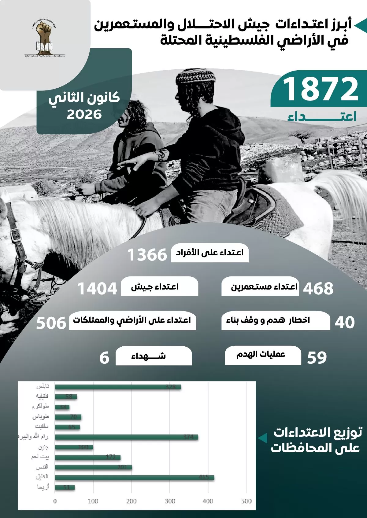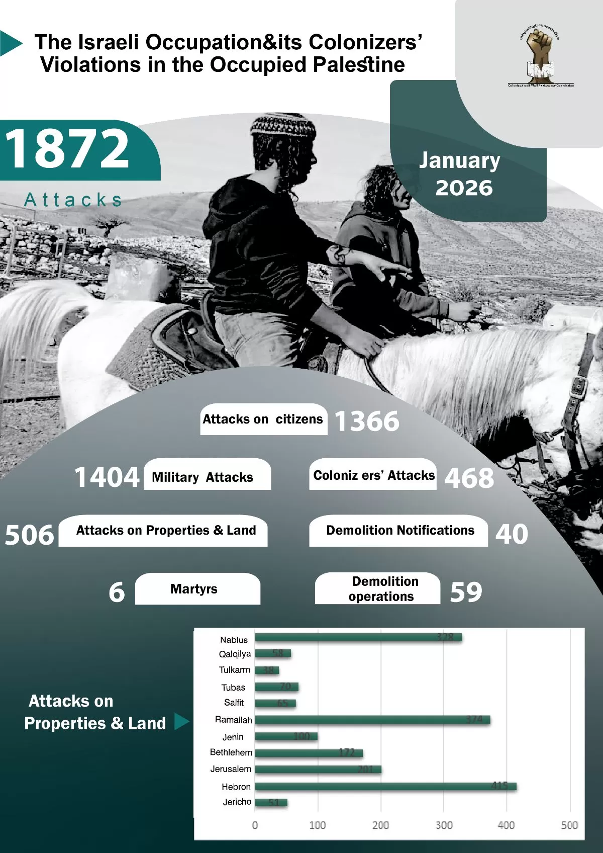 انفوغراف:انتهاكات دولة الاحتلال والمستعمرين خلال شهر كانون الثاني 2026
