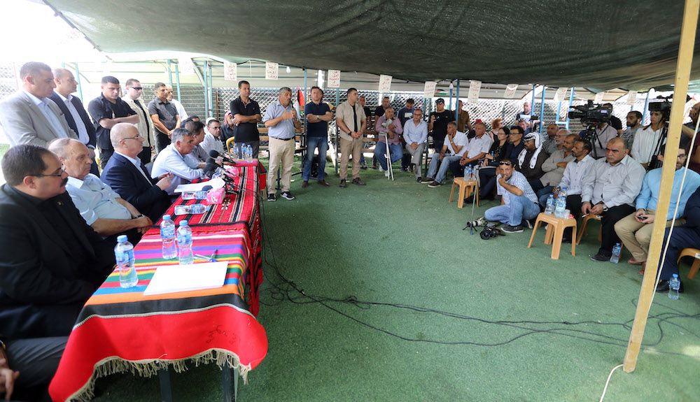 وحيّا رئيس الوزراء نيابة عن الرئيس محمود عباس، حراس الأرض من أهالي التجمع، وكوادر هيئة مقاومة الجدار والاستيطان، ونشطاء المقاومة الشعبية السليمة، وحركة "فتح"، والحركات الوطنية والإعلاميين الذين احتشدوا للتصدي لمحاولة اقتلاع اصحاب الأرض، وإعطاء المقاومة الشعبية السلمية المزيد من القوة والعنفوان، حيث تمكنا بضغط شعبي ورسمي ودولي من انتزاع قرار بتأجيل عملية الهدم حتى منتصف الشهر القادم".