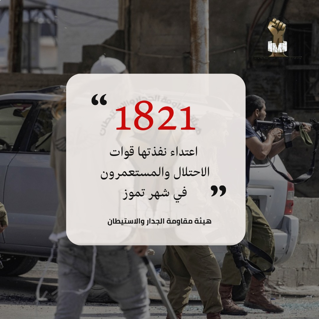 رام الله، 4 آب، 2025: قال رئيس هيئة مقاومة الجدار والاستيطان الوزير مؤيد شعبان، إن قوات الاحتلال الإسرائيلي والمستعمرين نفذوا ما مجموعه 1821 اعتداء، خلال تموز الماضي، في استمرار لمسلسل الإرهاب المتواصل من قبل دولة الاحتلال ضد الشعب الفلسطيني وأراضيه وممتلكاته.