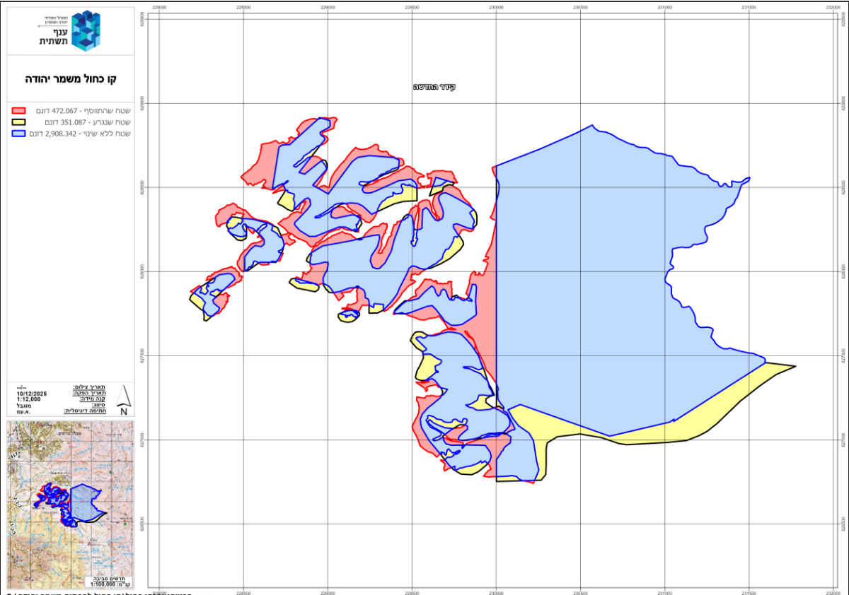 ملاحظة حول الخارطة الجانبية: خارطة الأمر العسكري (حدود شمال غرب المستوطنة) اللون الأزرق هي مساحة الإعلان بقيت كما هي 2908 دونم، اللون الأصفر تم إخراجها لكم عملياً بقت ضمن حدود المستوطنة مساحتها351.08 دونم، اللون الأحمر تمت إضافتها للإعلان مساحتها 472 دونم.