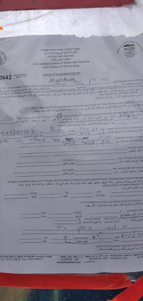 النبي صالح- تقوم قوات الاحتلال ممثلة بمن يدعى ضابط شؤون الاثار تقوم بتسليم ورقة وقف العمل في منطقة واد ريا صباح اليوم، لاصحاب اراضي بعد مشروع استصلاحها وزراعتها وتسيجها، وحسب الورقة يجب ازالة كافة الاضافات، من سياج، وبوابة، وشجر في هذه المنطقة.